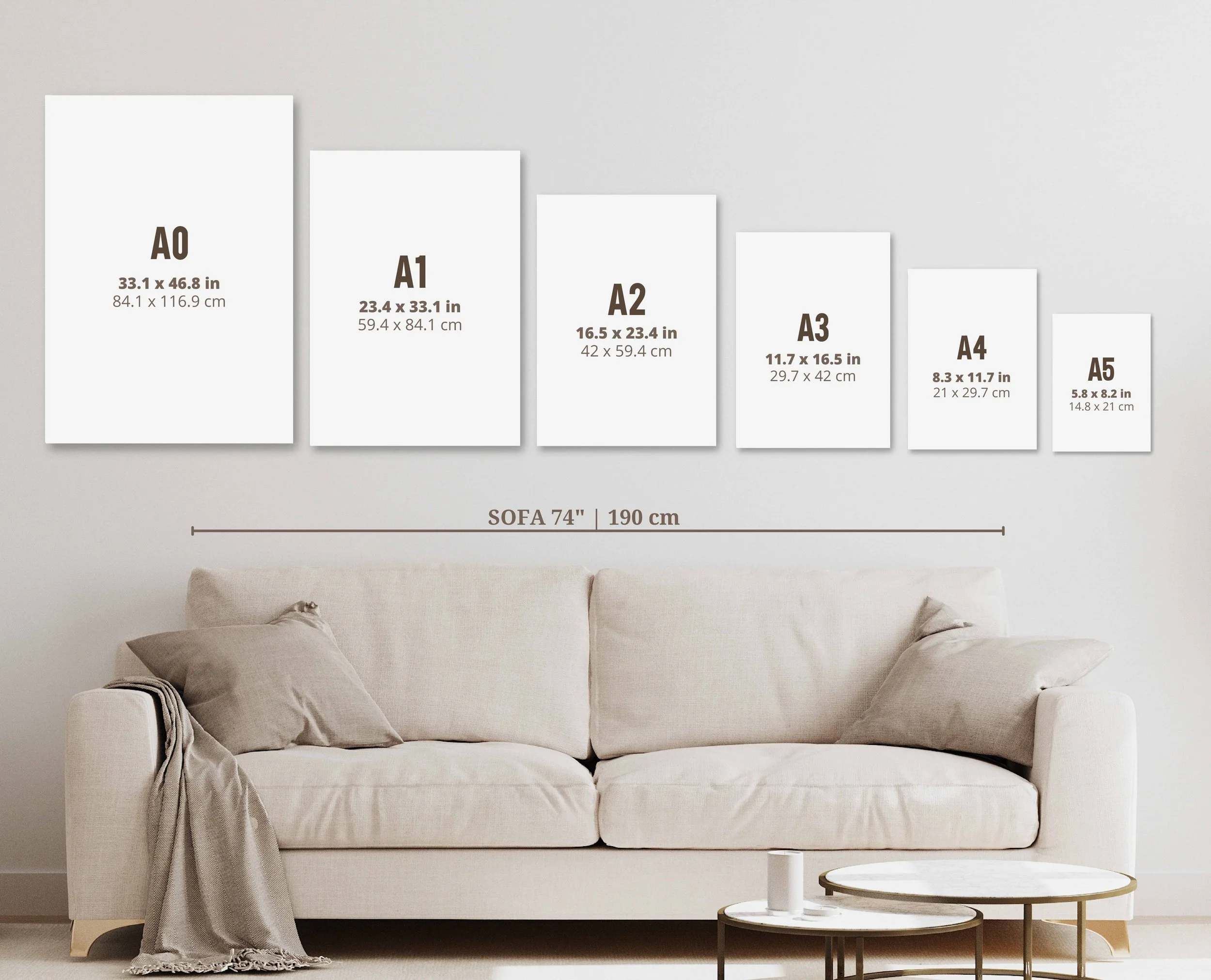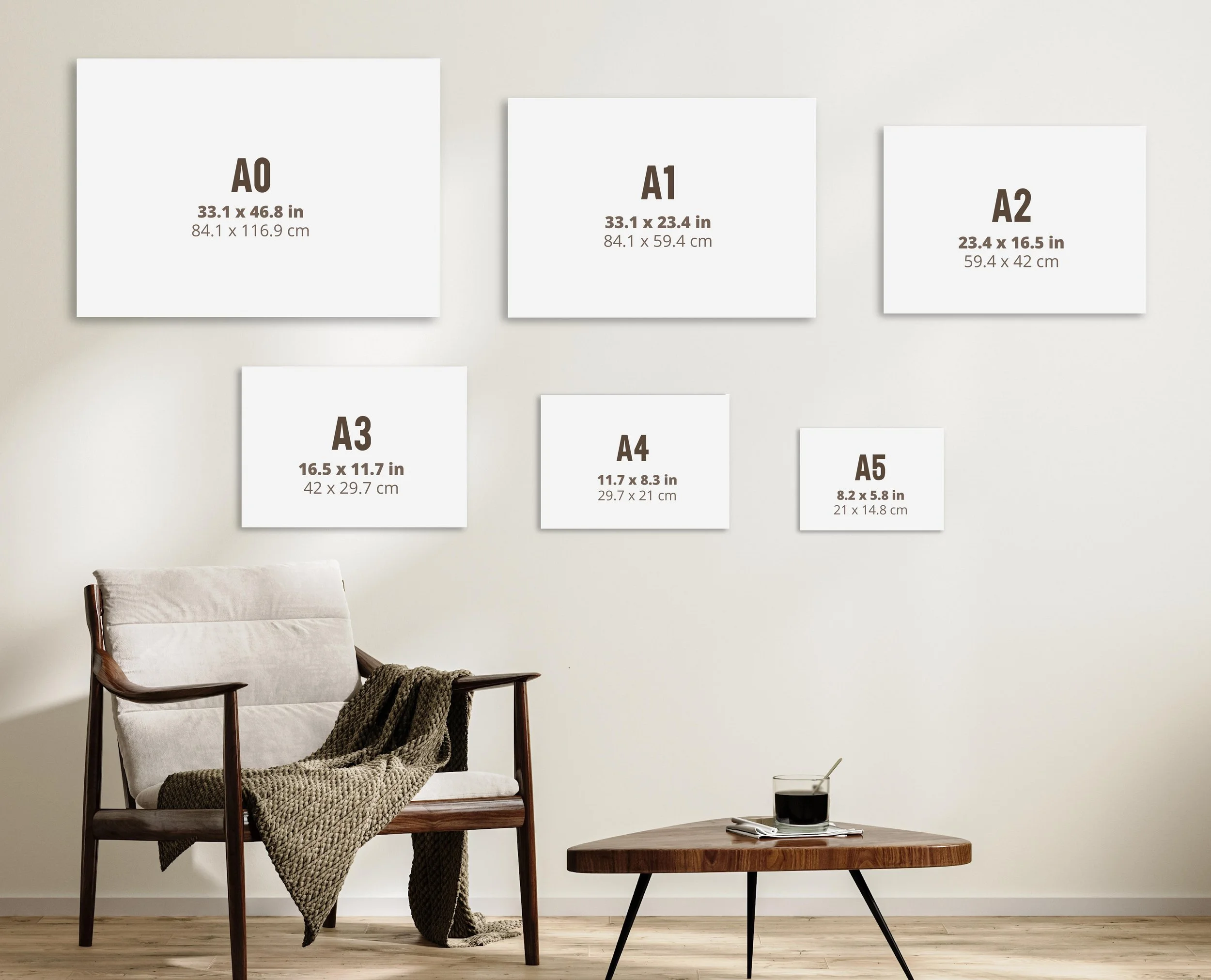 Finding the right size for framed prints in your space can be tricky. To keep things simple, we offer international paper sizes from A4 to A0. For our limited edition mini print series, we offer A5-size prints. Our prints are produced on high-quality 230GSM art paper with a luxurious, flat matte surface, featuring sharp detail and high colour saturation.